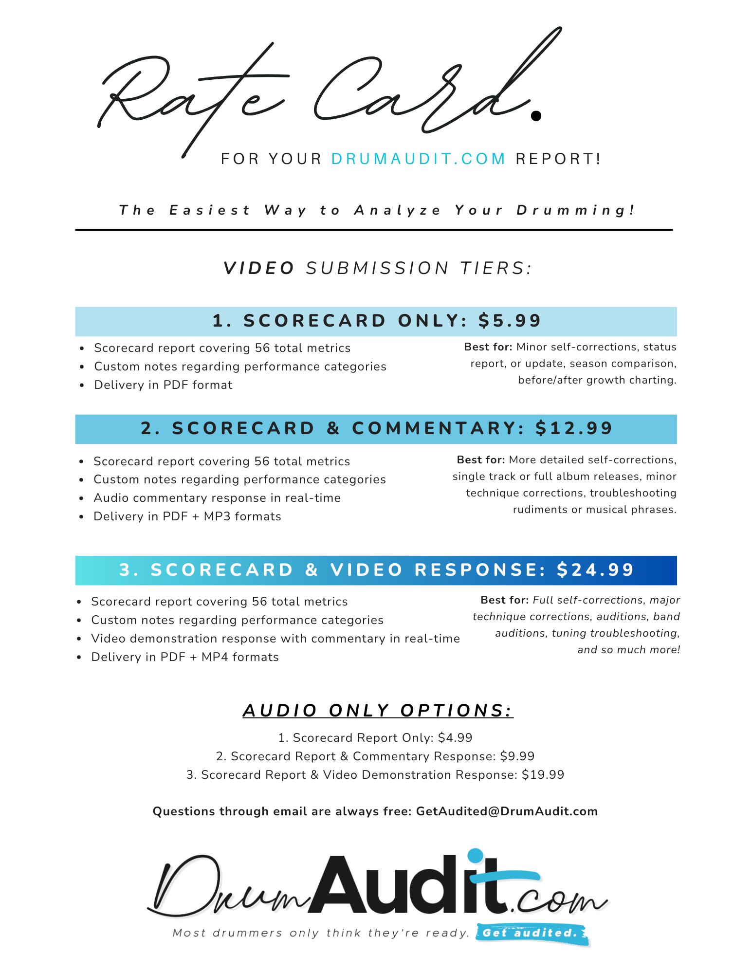Use the button below to pay for your DrumAudit.com purchase. Don’t forget to include your name and a reference to your form submission so we know which content to connect your payment to. Video submissions are for videos you record and want to submit. The Audio Only option is for submitting an audio recording that you’ve chosen to submit.
